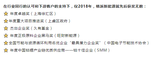 此外,公司子公司浙江中金格派鋰電產(chǎn)業(yè)股份有限公司獲評“2018年度中國鈷鋰產(chǎn)業(yè)鏈優(yōu)質(zhì)供應(yīng)商——鈷十佳企業(yè)”稱號。