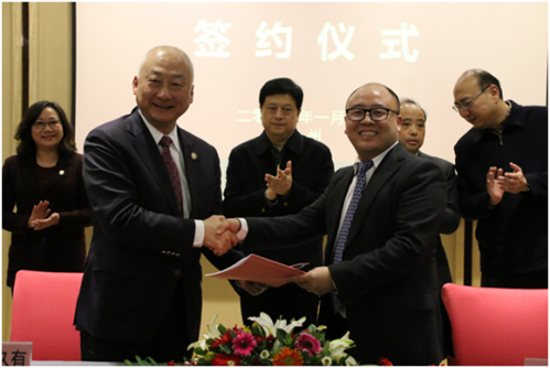 The picture is: Xiaolong Liu, the representative of Jiuyou Equity Investment Fund Partnership (Limited partnership) in Xiao county, signed a contract with Dongqiang Cao, the representative of Shanghai Greatpower Technology Group Co., LTD.