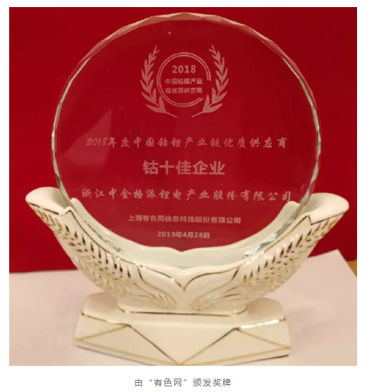 此外,公司子公司浙江中金格派鋰電產(chǎn)業(yè)股份有限公司獲評“2018年度中國鈷鋰產(chǎn)業(yè)鏈優(yōu)質(zhì)供應(yīng)商——鈷十佳企業(yè)”稱號。