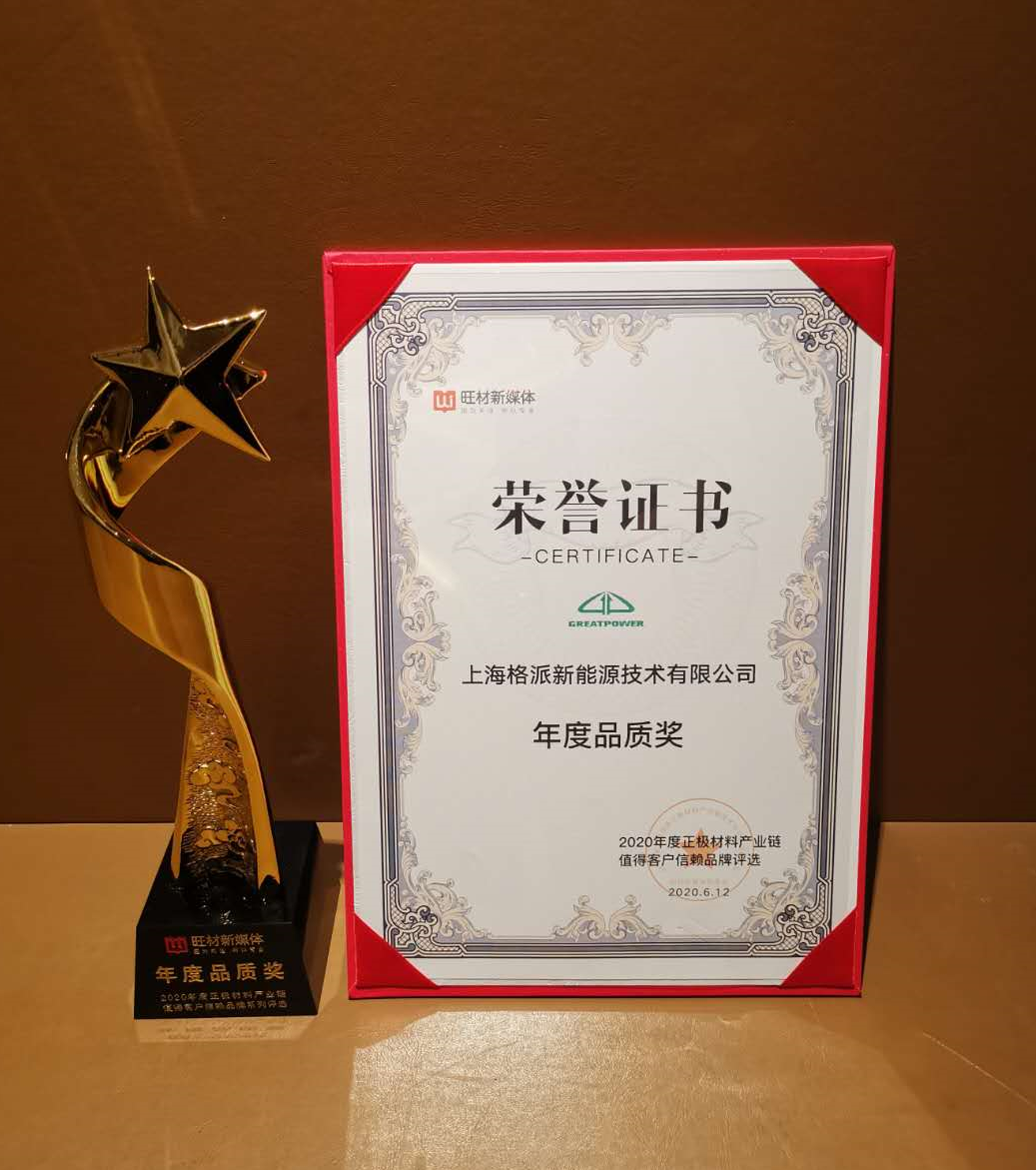 當晚,2020年度正極材料產業(yè)鏈值得客戶信賴品牌頒獎典禮正式開始。上海格派新能源技術集團有限公司被評委會授予“2020年度正極材料年度品質獎“稱號。