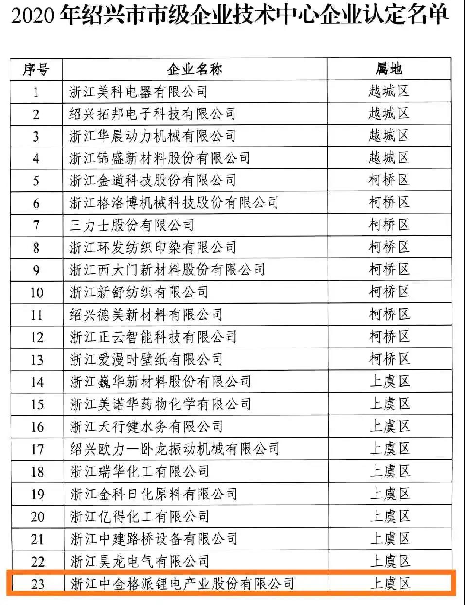 近日,從紹興市經(jīng)信委獲悉,經(jīng)多部門層層篩選和專家評審,浙江中金格派鋰電產(chǎn)業(yè)股份有限公司順利通過紹興市技術(shù)中心認(rèn)定。